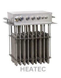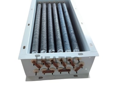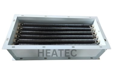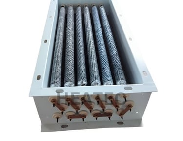 Duct heaters are devices which are an assembly of multiple heating elements mounted in a plate or casing and used to heat the air in a non pressurized condition. The Heater bundle is usually inserted inside a duct line or a insulated body through which air passes and get heated upto required temperature. Duct heater elements can be of open coil, tubular or finned tubular heating elements, depending upon the application, temperature etc. If any application needs a very large capacity of heat duty, several smaller capacities the duct heater bundles can be made and assembled in series. This will help not only to get desired temperature at varying process condition, but also eases the job of maintenance and spares cost.